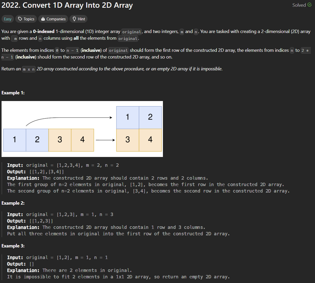 (Easy - Array) Leetcode - 2022. Convert 1D Array Into 2D Array