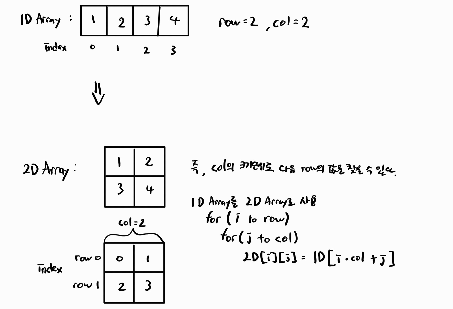 1D Array로 2D Array처럼 사용하기 위해서는 Index를 다음과 같이 사용하면 됩니다.