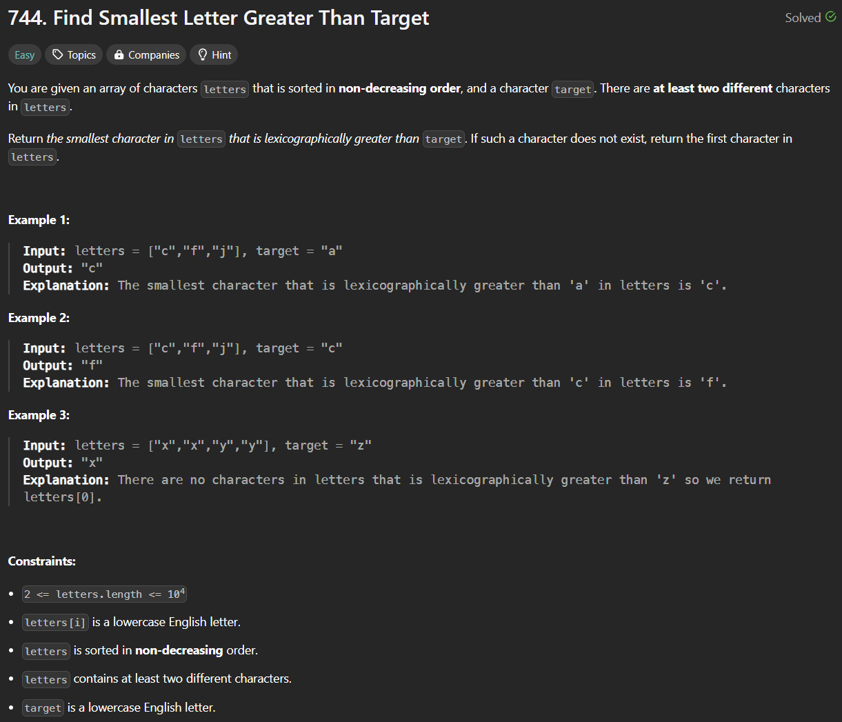 (Easy - Binary Search) Leetcode - 744. Find Smallest Letter Greater Than Target
