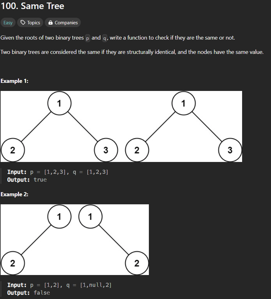 두 개의 트리가 구조와 각각의 노드가 모두 같은지 확인하는 문제입니다.