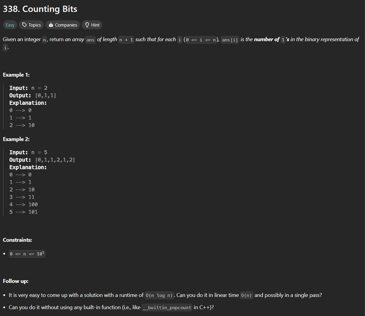 정수 n이 주어지면 0부터 n까지의 숫자를 2진수로 변환했을 때 각각의 2진수에 1이 몇 개인지세는 문제입니다.