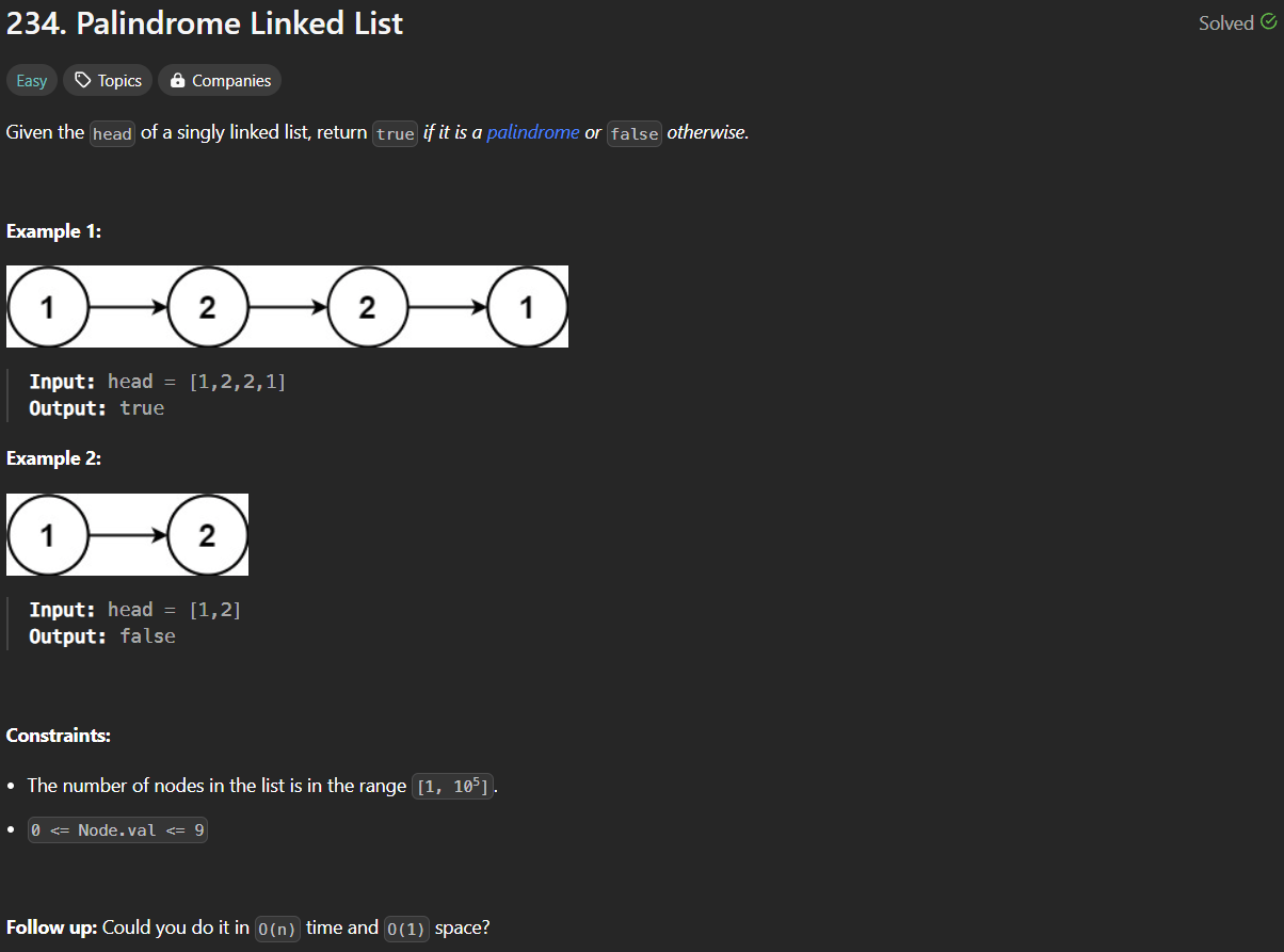 이 문제는 Linked-List가 주어졌을 때 이 리스트가 Palindrome인지 확인하는 문제입니다.
