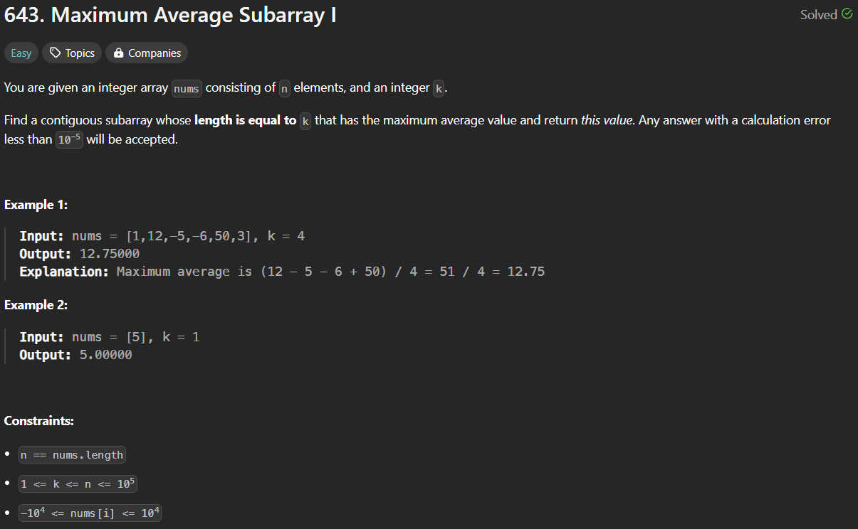 숫자 배열이 주어지면 이 배열 안에서 만들 수 있는 연속된 부분 배열들 중 가장 큰 부분 배열의 평균값을 찾는 문제입니다.